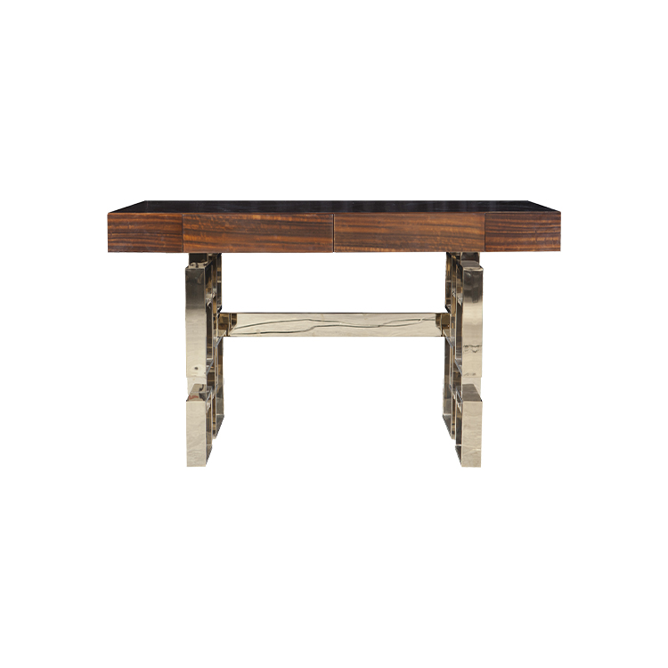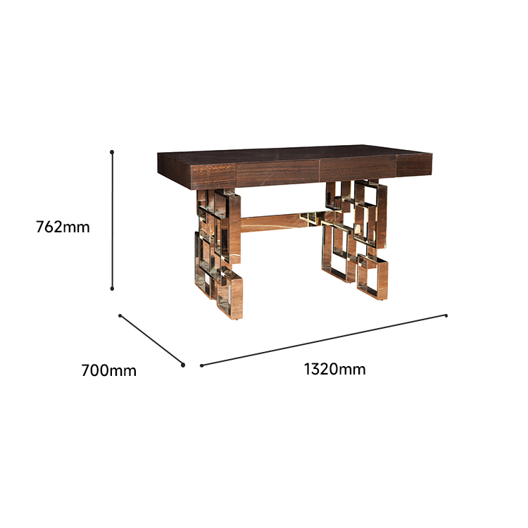 多元化风格设计运用,独特的金属造型底座,搭配木质纹路桌面,形成相互呼应浑然天成。 采用优质不锈钢材质,镀钛金涂层装饰,E1级MDF环保板材,煙熏重閃影尤加利拼花木皮薄饰面片