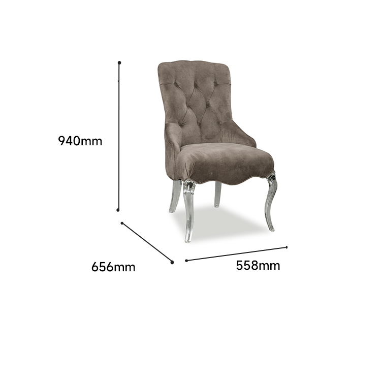 半弧型靠背搭配拉扣设计,水晶弯曲脚使整体造型梦幻时尚,该款产品使用广泛,与现代美式产品搭配极佳。 内框架杂木,优质亚克力,高档面料,高弹海绵填充。