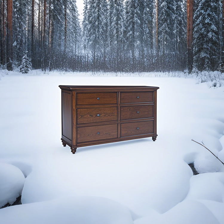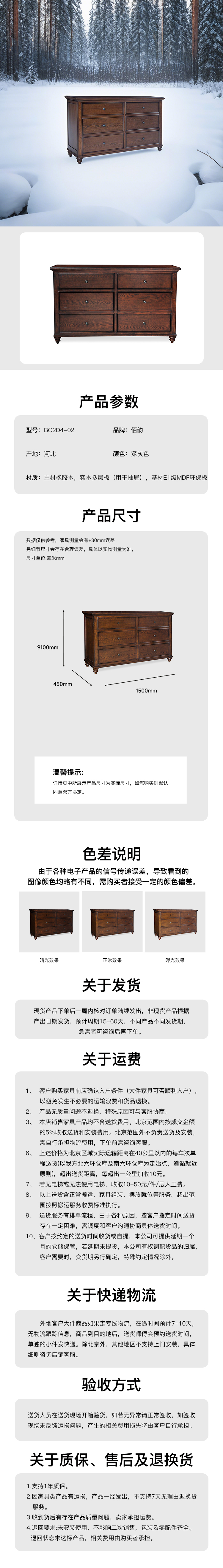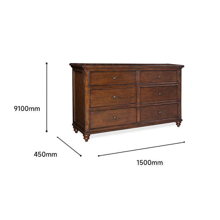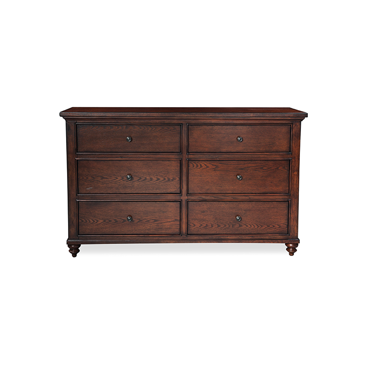采用红橡木薄片贴面,鲜明的山形木纹,纹理美观大方;饰面以人工凿痕、粗糙纹理、木材刻痕等工艺来体现;美式梳妆台,更多更大抽屉,大气实用;深褐色复古拉手,美观耐磨。