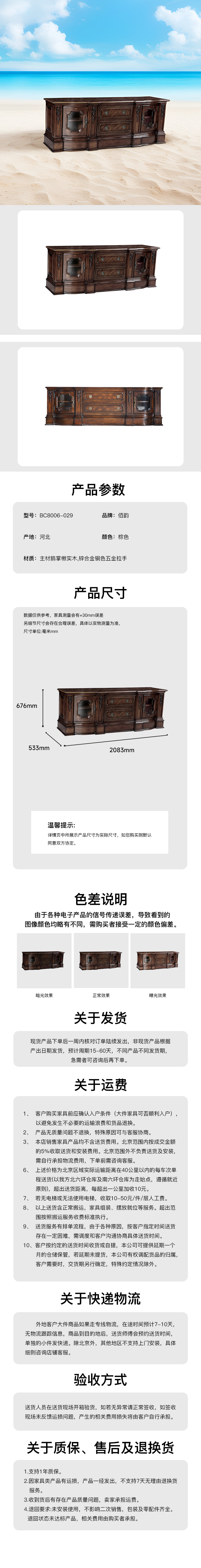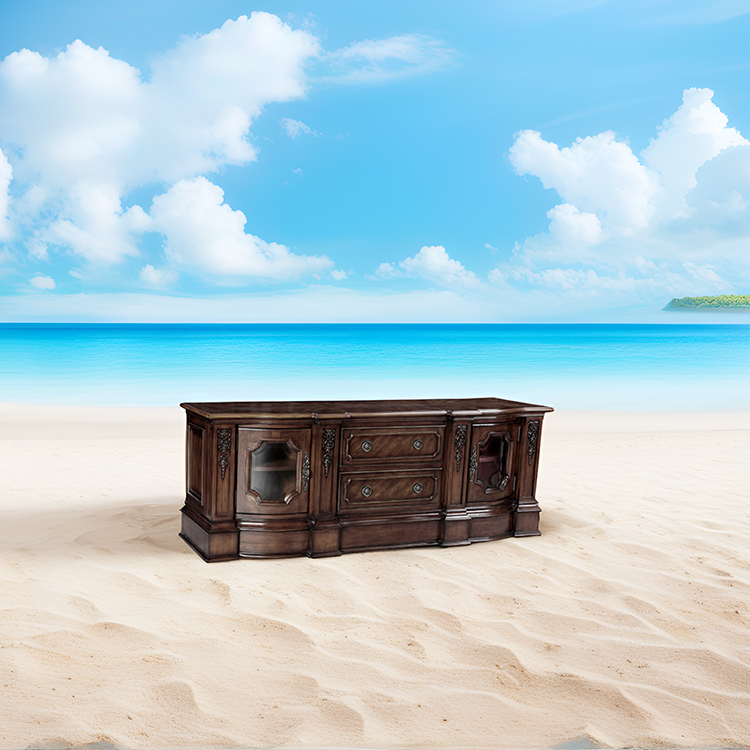 电视柜,其主体为美国进口鹅掌楸实木,饰面为进口稀有黄金旋涡花的薄片与樱桃木薄片结合,配以精美花纹雕刻,低调中又显奢华。中间两扇玻璃门搭配抽屉的结构设计可以解决储物的不同需求,两侧弧形门的设计增加了工艺难度,既提高了视觉效果,又让电视柜整体线条优美。